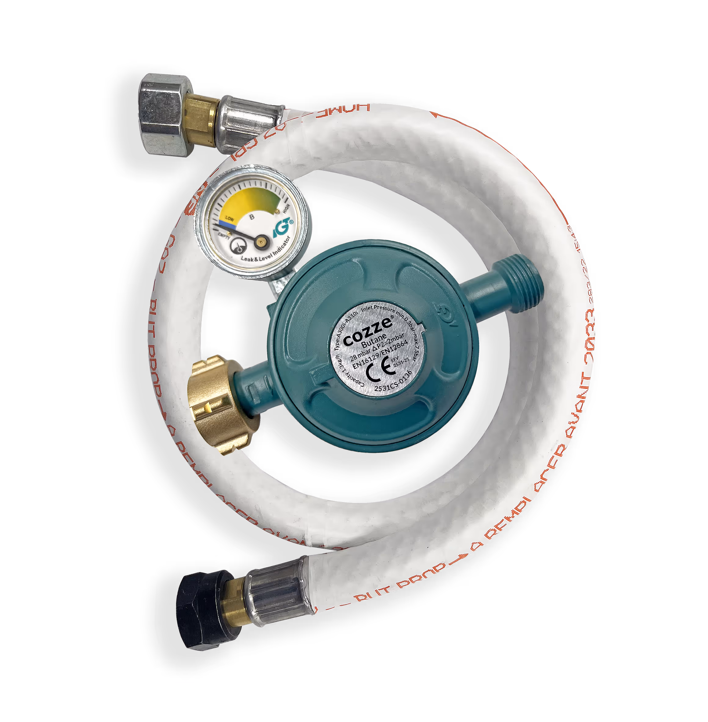 - 1.1 m steel flex hose, safety pressure gauge for leak testing.