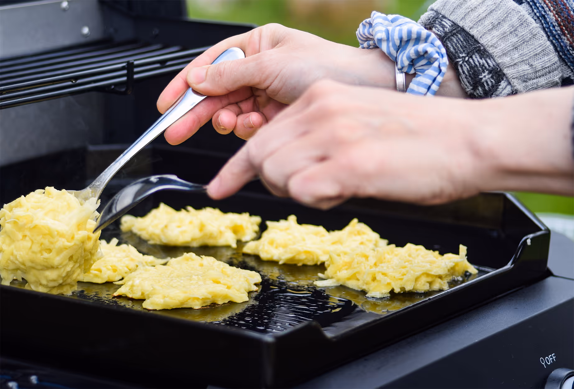 • Add oil to the plancha and use two spoons to shape small röstis. Fry until golden on both sides.